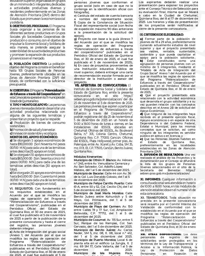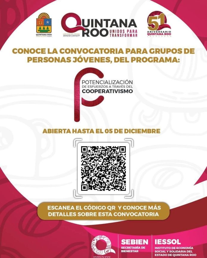 Cozumel, Quintana Roo, 4 de diciembre de 2025.- El gobierno municipal que encabeza José Luis Chacón Méndez reafirma su compromiso con el desarrollo de la juventud cozumeleña e informa que mañana es el último día para inscribirse en la convocatoria del programa “Potencialización de Esfuerzos a través del Cooperativismo”, una iniciativa que impulsa proyectos productivos y fortalece la economía social y solidaria. Esta oportunidad está dirigida a jóvenes que buscan emprender, organizarse y crecer en comunidad.
