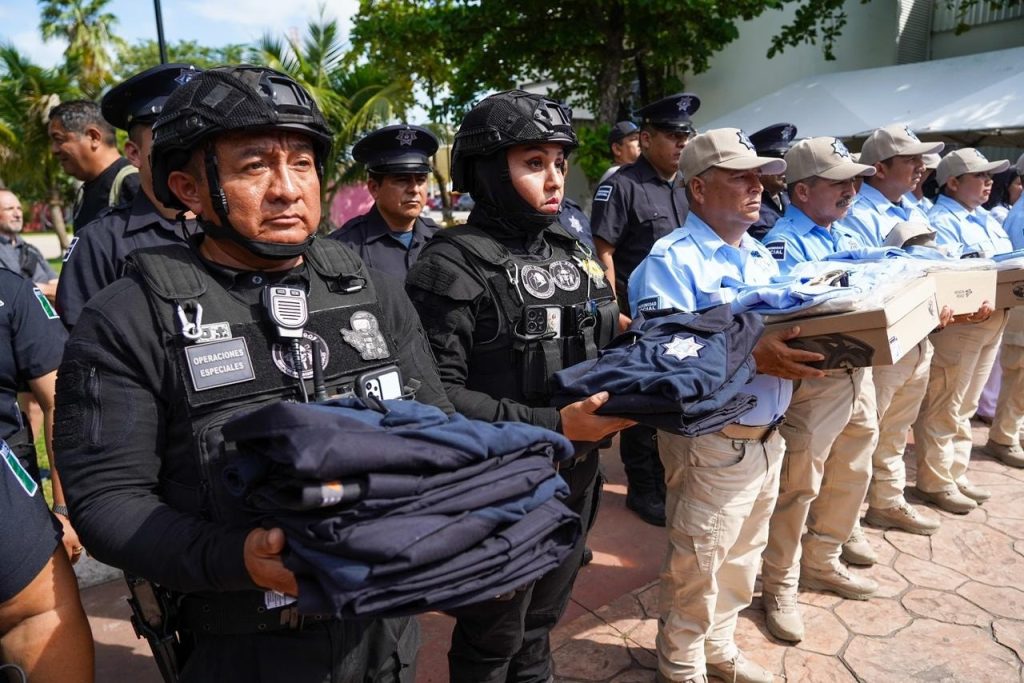 De manera simbólica, se hizo entrega del equipamiento a las y los policías turísticos Arturi Carrillo Noz, Yadira Reyes García, Josué Alejandro Mateo, Wilbert Nicolás Cruz Ku y Carlampio Guillén Jiménez. Asimismo, recibieron uniformes integrantes del Grupo Táctico de la Policía Municipal: María Antonia del Jesús Garavita Flores, Yuridia Pérez de la Cruz, Alexander Alcudia de la Cruz y Leodegario Tuz Dzib.
