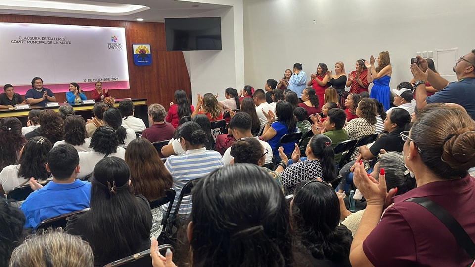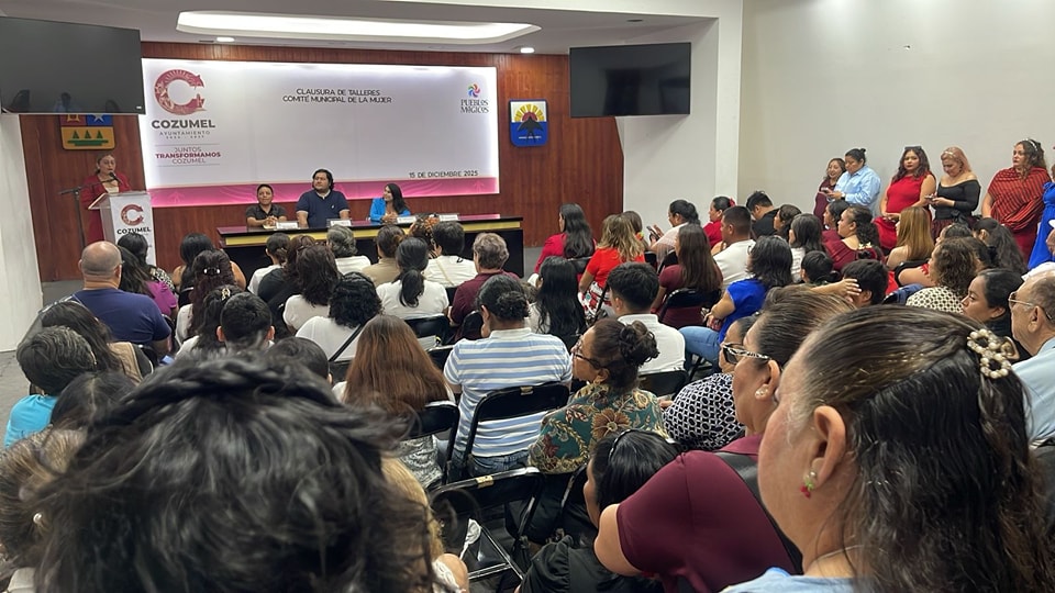 Cozumel, Quintana Roo, 16 de diciembre de 2025.- El gobierno municipal de Cozumel, que encabeza el presidente municipal José Luis Chacón Méndez, llevó a cabo la clausura de los talleres del Comité Municipal de la Mujer (COMUMU), en un evento en el que se reconoció el esfuerzo de las 101 alumnas, así como la dedicación de las y los profesores y de todo el equipo que integra este comité, quienes de manera conjunta contribuyen al fortalecimiento y desarrollo de las mujeres cozumeleñas.
