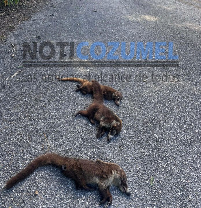 Cozumel, Quintana Roo, 9 de febrero de 2025.- Una familia de coatíes, integrada por dos adultos y un juvenil, fue hallada muerta en la carretera sur antes de llegar a la curva de Punta Sur, con evidentes rastros de atropellamiento. El hecho fue difundido en redes sociales por el biólogo Rafael Chacón Díaz, quien lamentó que este tipo de incidentes se haya convertido en un común denominador en la isla.