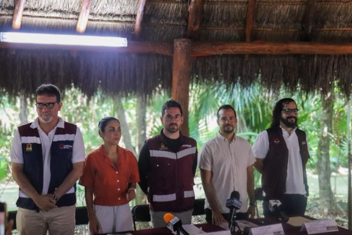 Acompañaron al secretario en el presídium: Nahielli Margarita Orozco Lozano, secretaria Municipal de Ecología y Desarrollo Urbano; Javier Carballar Osorio, titular del Instituto de Biodiversidad y Áreas Naturales Protegidas (IBANQROO); Fernando Haro Salinas, director general de Ecología del Municipio de Benito Juárez y Pablo Rubio Taboada, director de Áreas Naturales Protegidas.