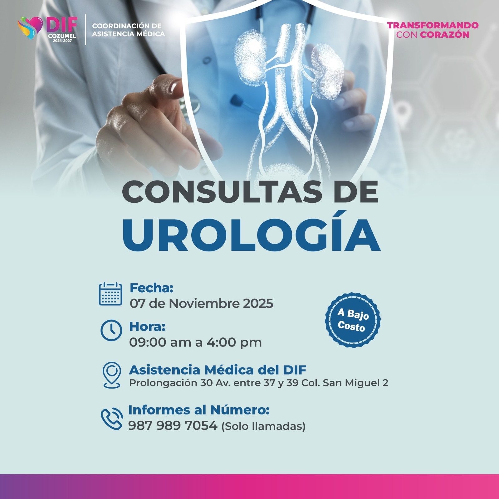Cozumel Quintana Roo, 5 de noviembre de 2025.- El Gobierno de Cozumel, encabezado por el Presidente Municipal José Luis Chacón, a través del Sistema DIF Cozumel que preside Diana Sosa Blanco, anuncia el regreso de las consultas médicas de especialidad en Urología con una cuota de recuperación mínima. Esta acción busca proteger la salud y la economía de las familias cozumeleñas.