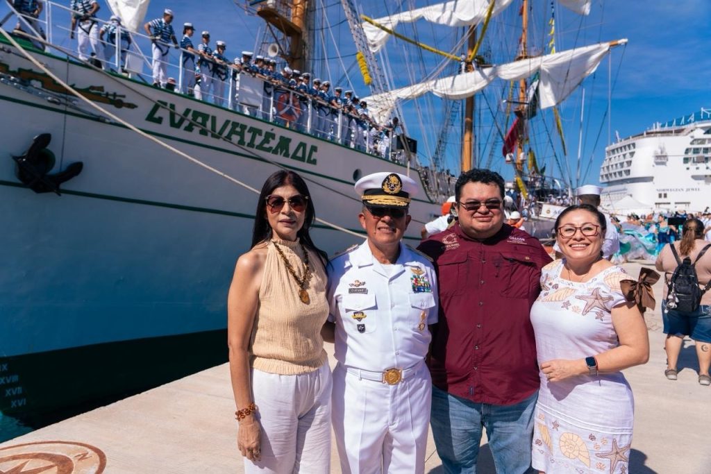 El presidente municipal, José Luis Chacón Méndez, acompañado de su esposa Diana Sosa, encabezó la ceremonia oficial de bienvenida a la tripulación, integrada por cadetes y marinos que representan con honor y disciplina a México en los mares del mundo.