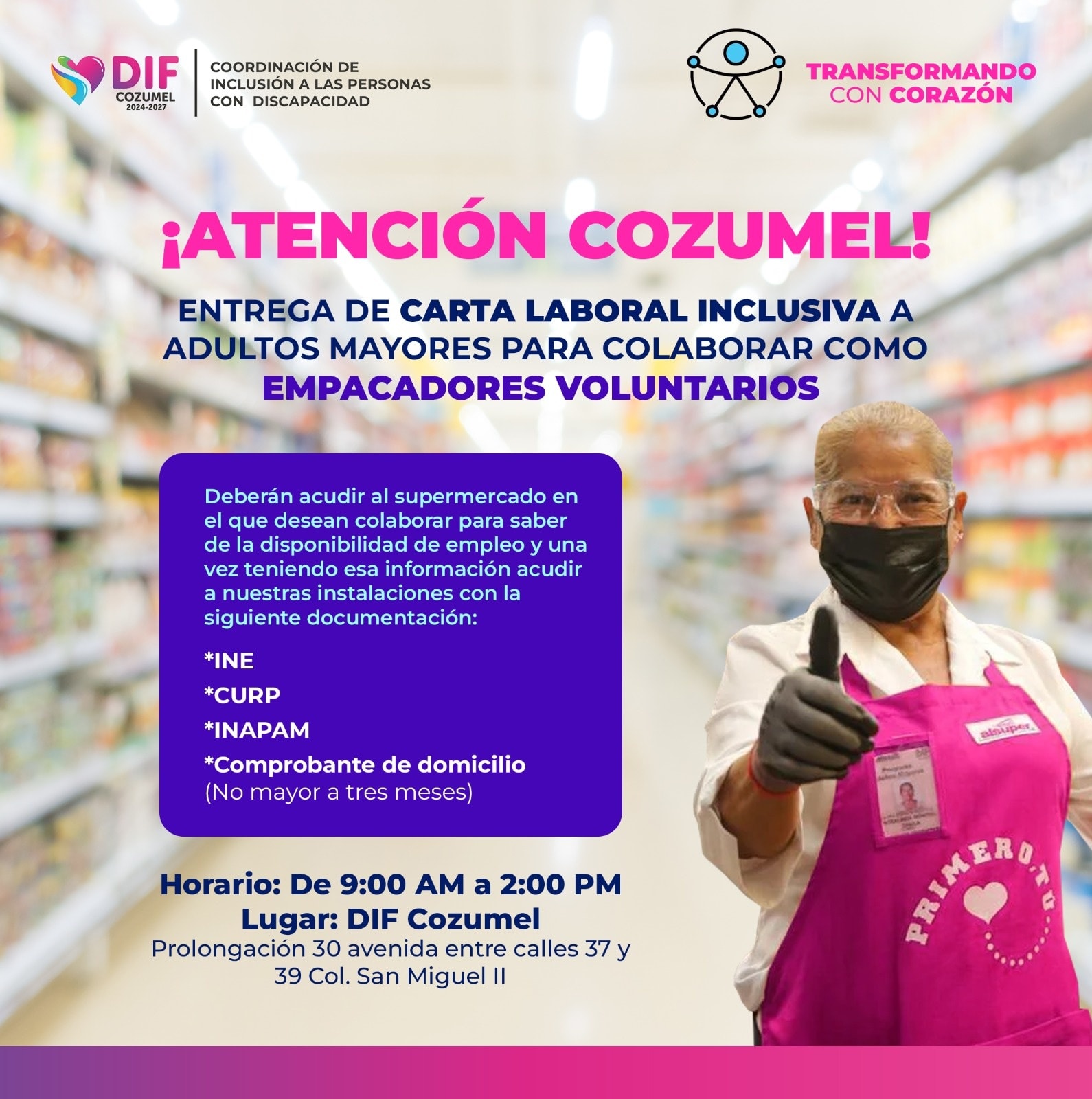 Cozumel, Quintana Roo, 15 de diciembre de 2025.– Con el compromiso de fomentar un modelo económico más justo, incluyente y competitivo, el Gobierno Municipal que encabeza José Luis Chacón, junto al Sistema DIF Cozumel que preside Diana Sosa Blanco, a través de la Coordinación de Inclusión, pone a disposición de las personas adultas mayores la Carta Laboral Inclusiva para colaborar como empacadores voluntarios en supermercados de la isla.