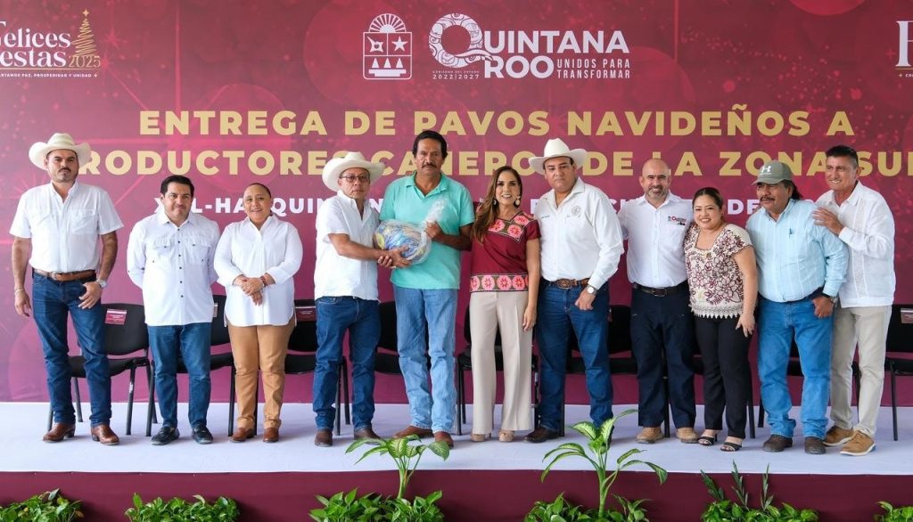 Xul-Ha, Othón Pompeyo Blanco, Quintana Roo, 15 de diciembre de 2025.- La gobernadora Mara Lezama Espinosa expresó su total respaldo a los cañeros del sur de Quintana Roo durante un evento de entrega de 3 mil 640 pavos a productoras y productores, en respuesta a una petición, una necesidad, para fortalecer a las familias en esta temporada navideña.