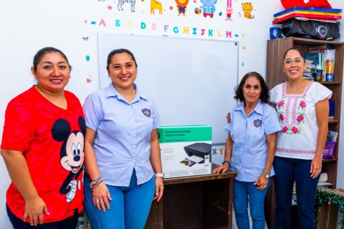 Entrega Marifer Vargas impresora al aula USAER de la primaria Benito Juárez en Cozumel