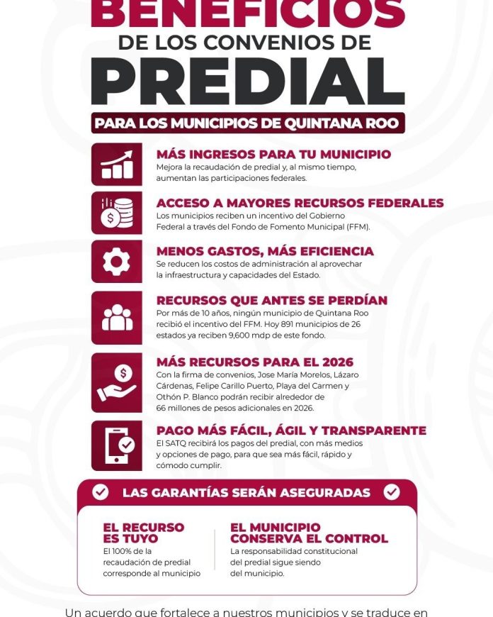 Durante más de una década, ningún municipio de Quintana Roo había accedido a estos incentivos. Con la firma de convenios por parte de los municipios de José María Morelos, Lázaro Cárdenas, Felipe Carrillo Puerto, Playa del Carmen y Othón P. Blanco, se estima que podrán recibir alrededor de 66 millones de pesos adicionales en 2026, recursos que anteriormente se perdían.