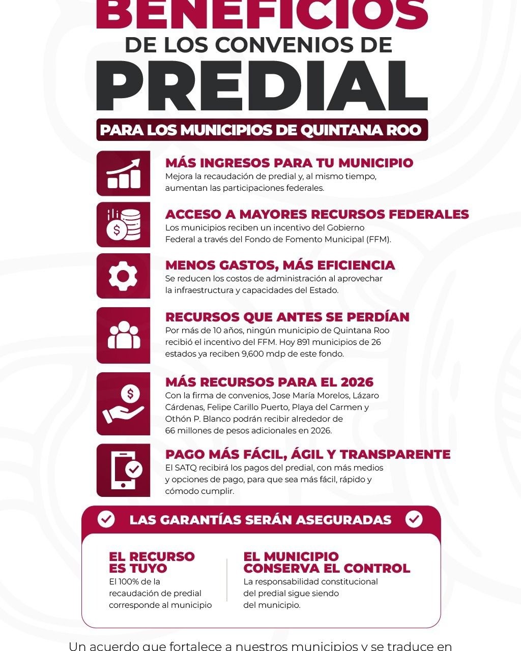 Es importante destacar que el impuesto predial sigue siendo responsabilidad del municipio, quienes conservan el 100% de la recaudación, así como la facultad de cancelar el convenio cuando así lo determinen.