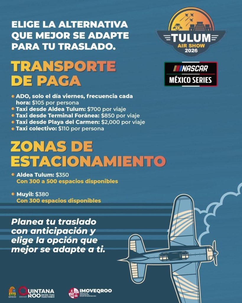 De manera complementaria, se contará con diversas opciones de transporte de paga para quienes opten por alternativas adicionales, entre ellas el servicio ADO disponible únicamente el día viernes con un costo aproximado de 105.00 pesos por persona; taxi privado desde Aldea Tulum por 700.00 pesos por viaje; taxi desde la Terminal Foránea por 850.00 pesos; taxi desde Playa del Carmen por 2 mil pesos; así como servicio de taxi colectivo desde Aldea Tulum con un costo aproximado de 110.00 pesos por persona.