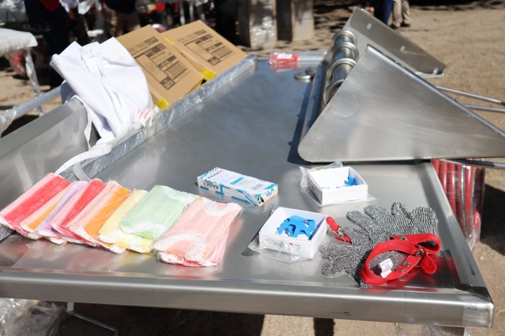 Entre los equipos entregados destacan mesas de acero inoxidable soldadas, racks para vísceras, reflectores, mangueras, polipastos, archiveros de cuatro cajones, guantes de látex, cubrebocas, mandiles de PVC, porta cabezas, crayones para carne, juegos de cuchillos, chairas y ganchos para carne. Estos insumos son fundamentales para asegurar que las labores de sacrificio y manejo de productos se realicen bajo estrictas medidas de higiene.