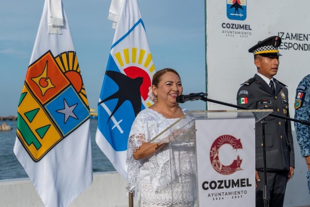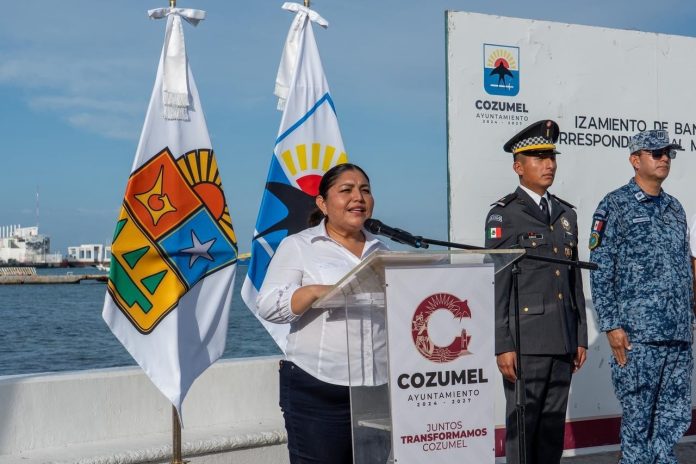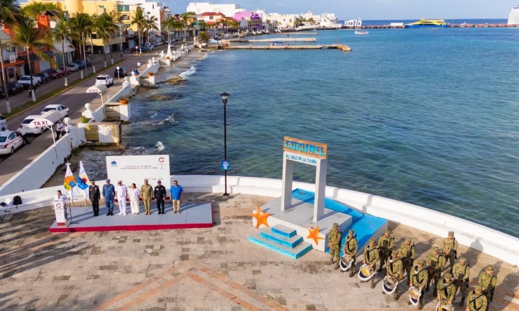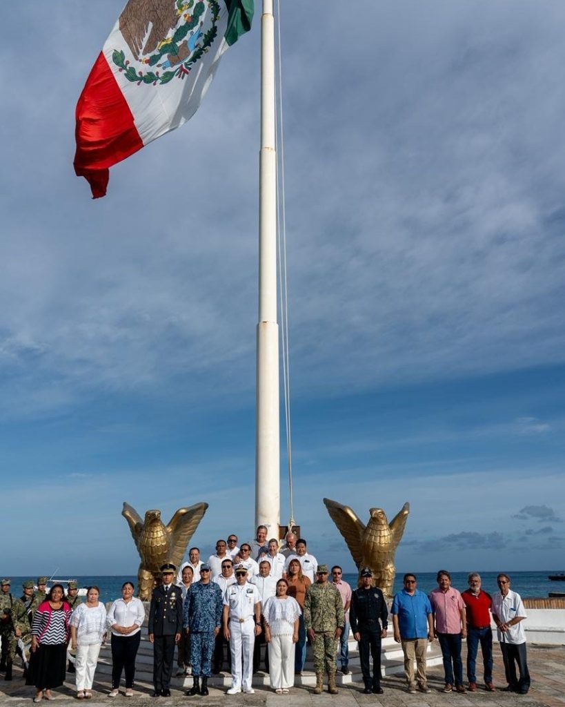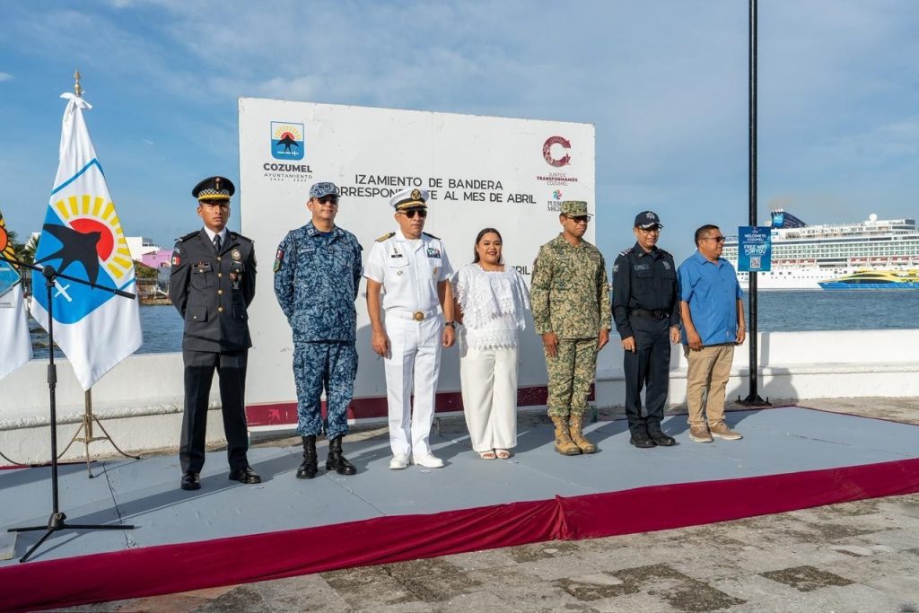 Cozumel, Quintana Roo, 1 de abril de 2026. – Para fomentar los valores cívicos en la comunidad isleña, el Gobierno Municipal en coordinación con las Fuerzas Armadas, llevó a cabo el primer izamiento de bandera correspondiente al mes de abril.