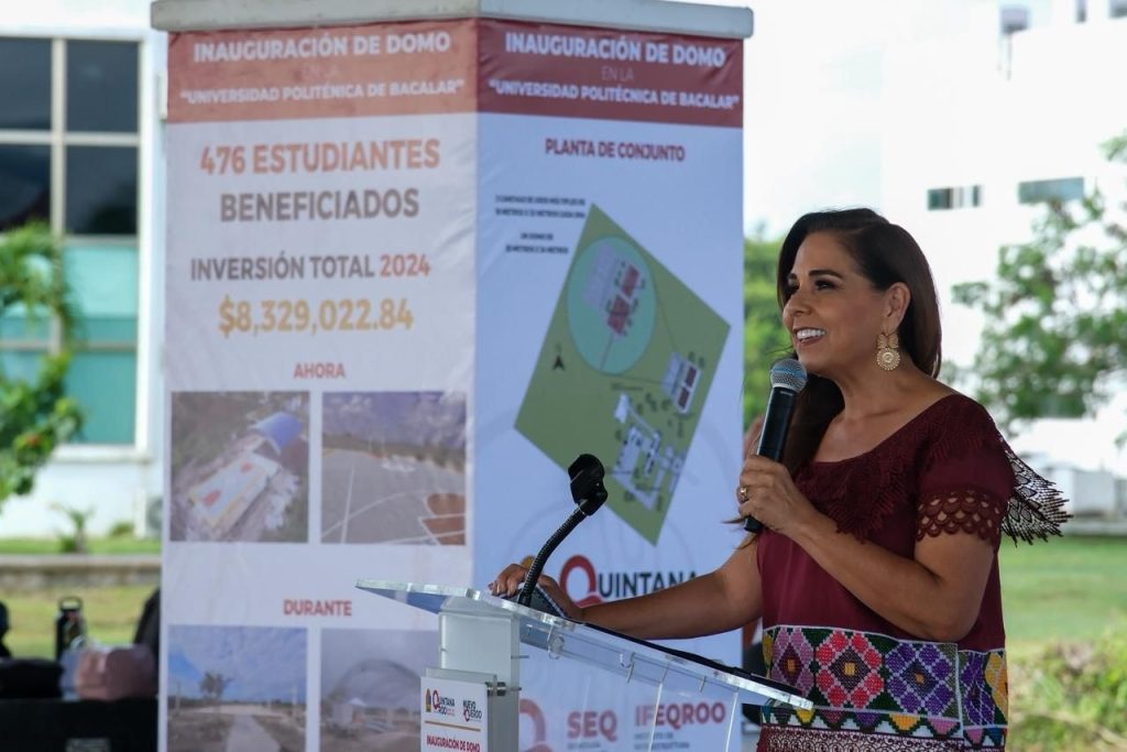Bacalar, Quintana Roo, 29 de octubre de 2025.- La gobernadora Mara Lezama Espinosa inauguró en la Universidad Politécnica de Bacalar un nuevo domo con cancha doble de usos múltiples, en donde la inversión educativa verificada es superior a los 8.3 millones de pesos beneficia a 476 alumnos, 255 mujeres y 221 hombres, de las 10 carreras que se imparten en esta institución.