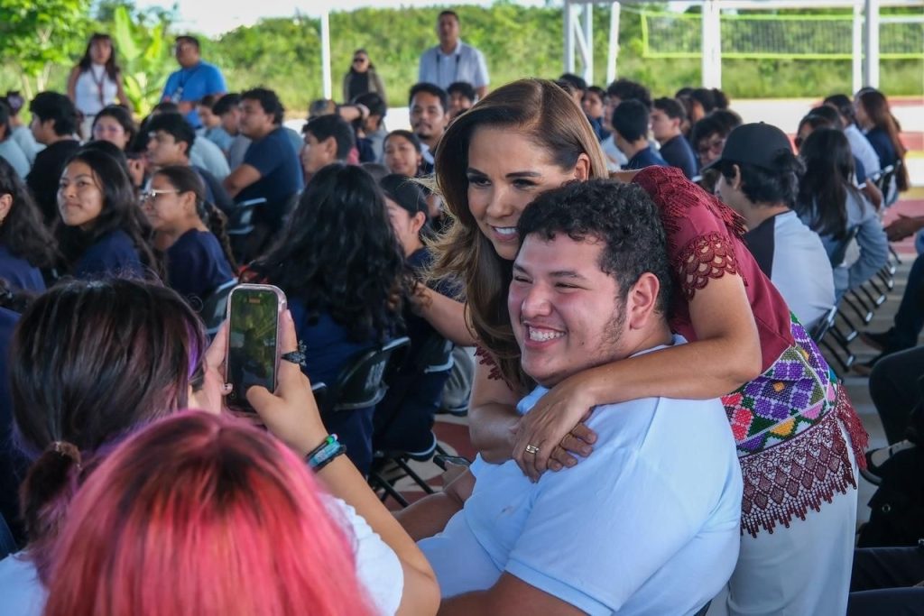 Acompañada de la presidenta honoraria del DIF Quintana Roo, Verónica Lezama Espinosa, y del presidente municipal, José Alfredo Contreras Méndez, Mara Lezama saludó a las y los alumnos a su llegada, así como a maestras y maestros que conforman la plantilla educativa.