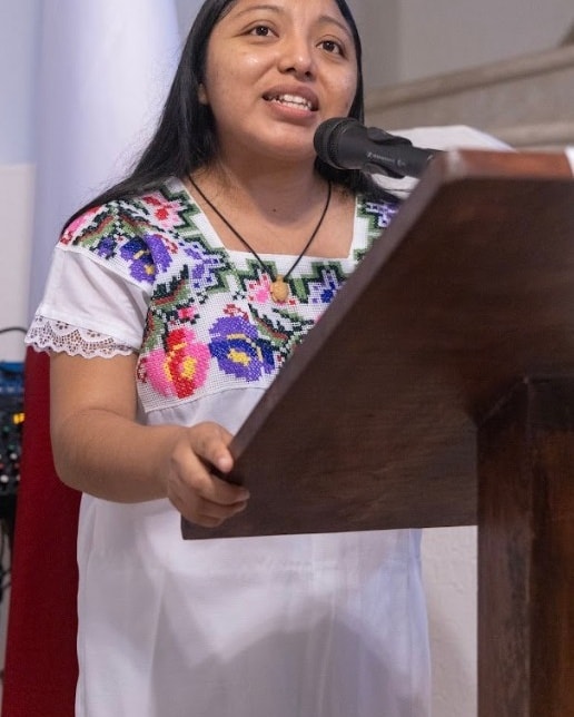 Uno de los momentos más emotivos de la noche fue la intervención de Gelmy Alondra Chan Pisté, estudiante del séptimo semestre de Turismo Alternativo y Gestión del Patrimonio. Tras recitar un poema en lengua maya, afirmó que el legado de su pueblo permanece vivo pese a los prejuicios históricos que lo situaron como una civilización admirable pero extinta.