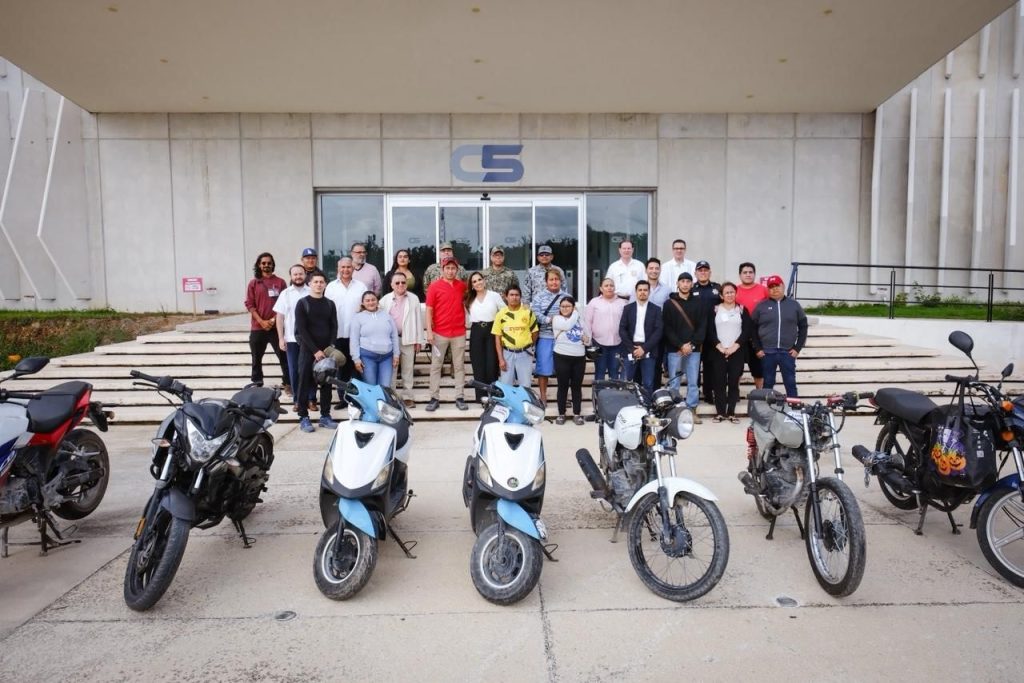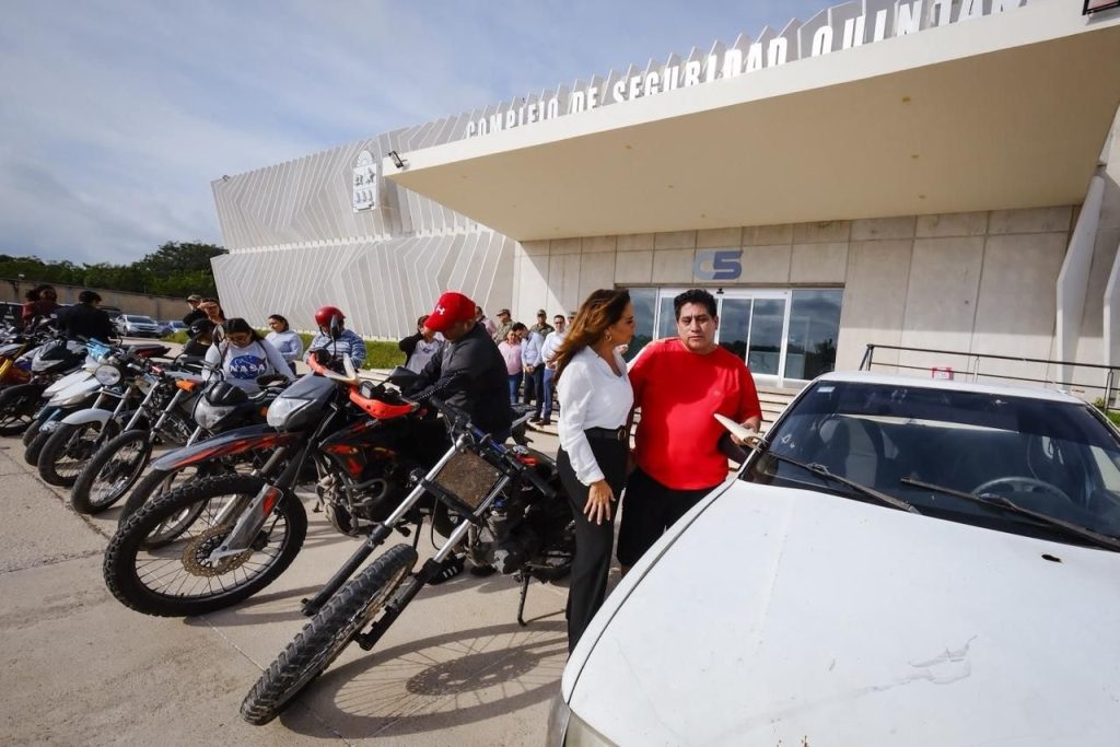Cancún, Quintana Roo, 13 de noviembre de 2025.- Un total de 12 motocicletas y un vehículo recuperados por la Fiscalía General del Estado fueron entregados a sus legítimos propietarios por la gobernadora Mara Lezama Espinosa junto con integrantes de la Mesa de Seguridad.