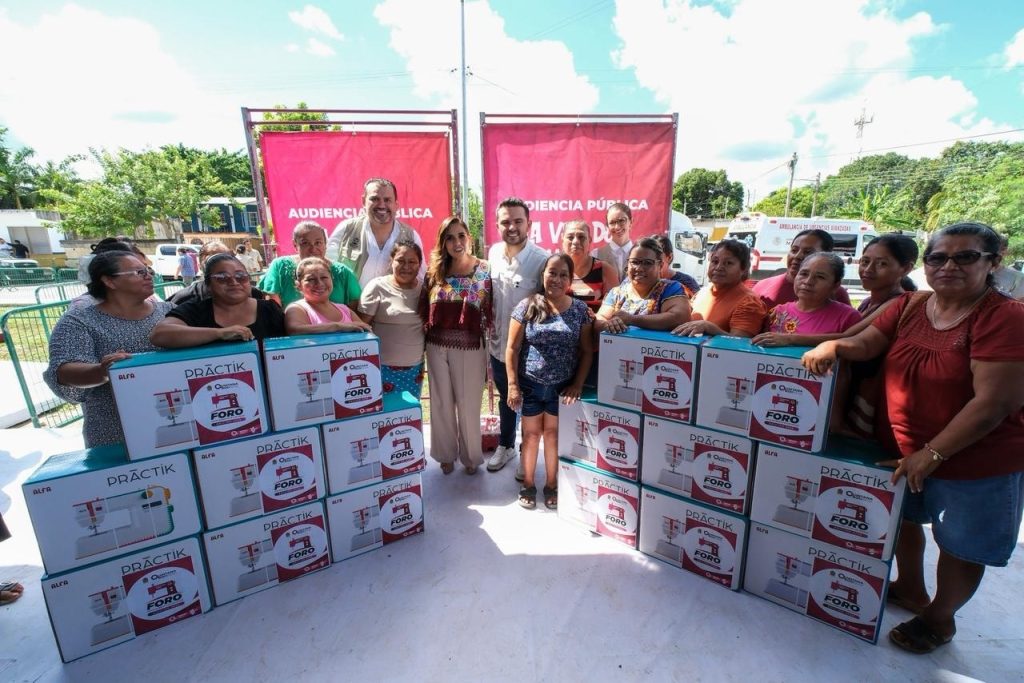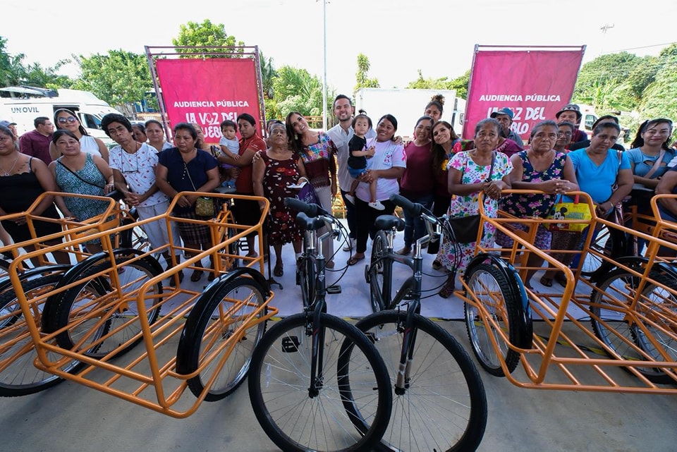 Durante el transcurso de la audiencia, la gobernadora Mara Lezama entregó, a través de la Secretaría de Bienestar, 43 paquetes de láminas de zinc, 23 triciclos y 3 bicicletas, del programa Apoyos del Bienestar; además, 17 máquinas de coser del programa Fortalecimiento a los Oficios (FORO).