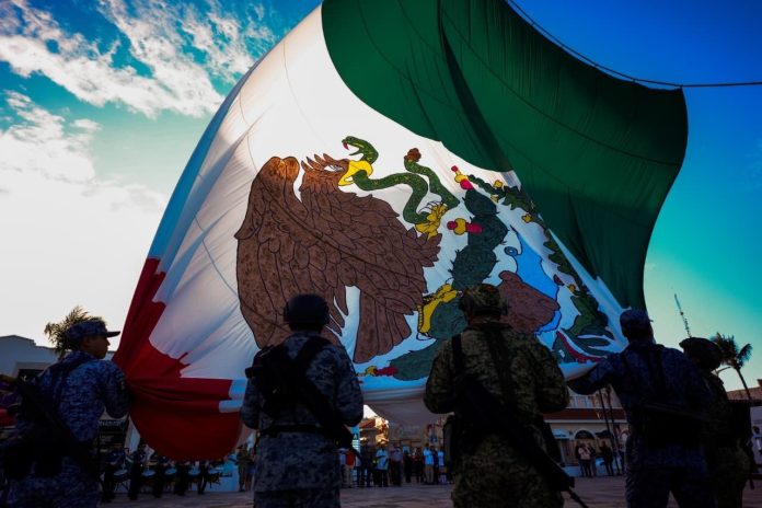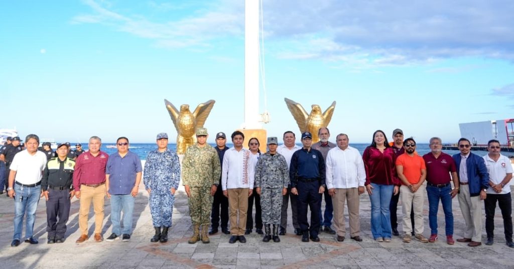 Cozumel, Quintana Roo, 5 de enero de 2026.- La mañana de este lunes, en la explanada de la Bandera, se llevó a cabo el primer izamiento de la Bandera Monumental del año, ceremonia cívica en la que participaron autoridades municipales, fuerzas destacamentadas, así como alumnas y alumnos de instituciones educativas, quienes rindieron los honores correspondientes al lábaro patrio.