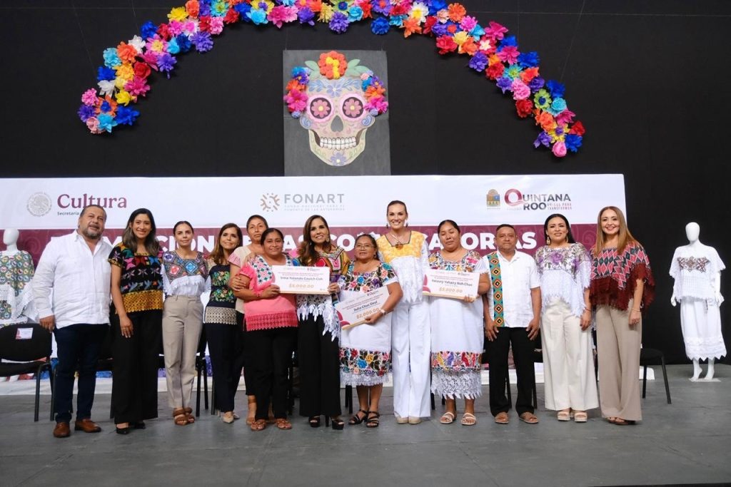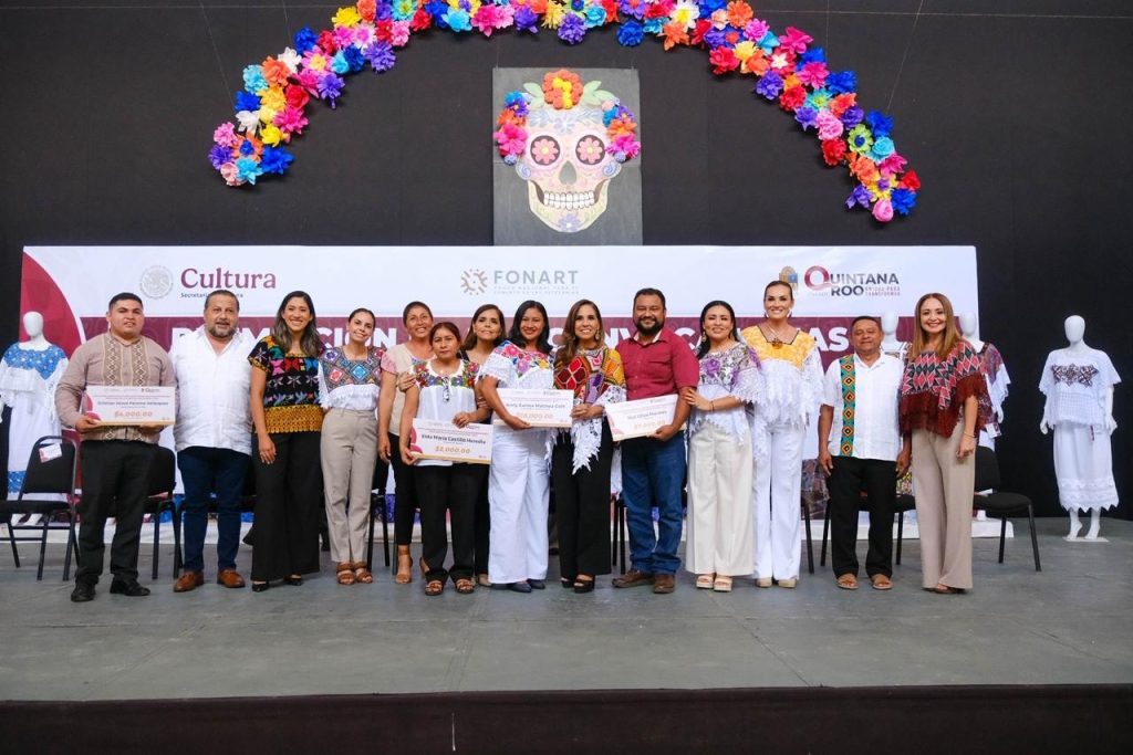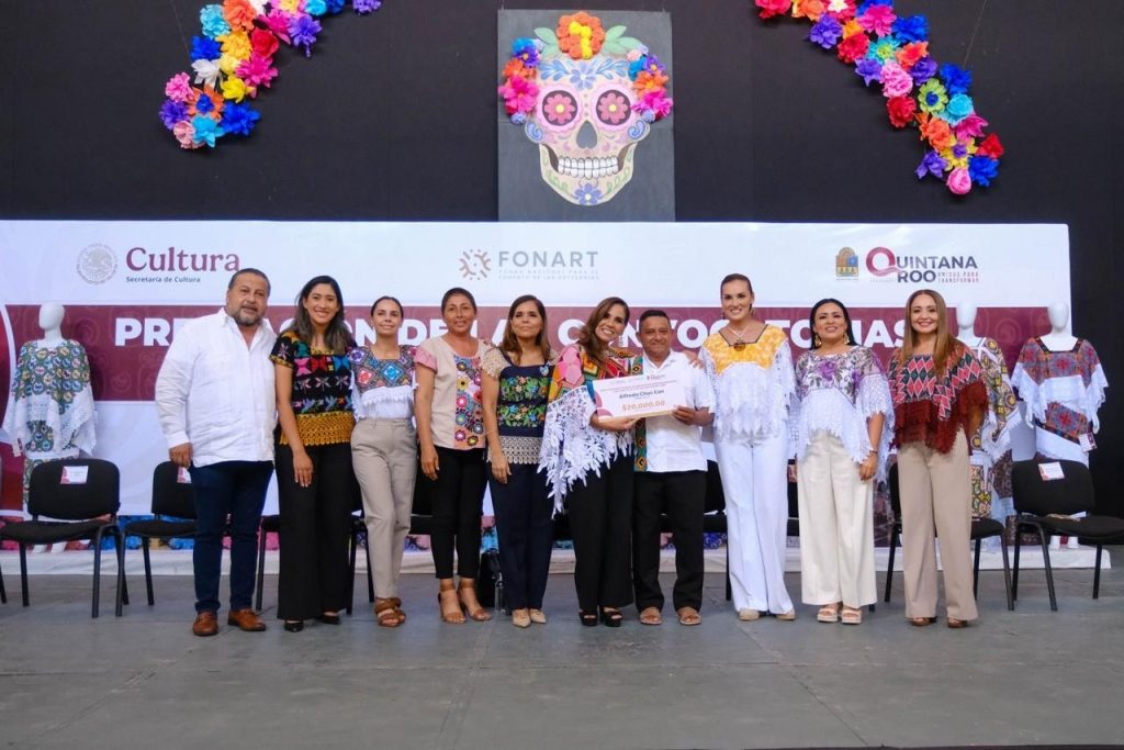 La gobernadora Mara Lezama entregó los premios estatales por categoría a: Rosa García Cabrera, del concurso “Chuuy K’K’aab”, originaria de la comunidad de Emiliano Zapata. Rescata la técnica de deshilado con una blusa bordada en honor a su hermana que ya falleció. Y a Alfredo Chuc Can, del concurso “Deja que te lo cuenten mis manos”, originario de la comunidad de X’Pichil.