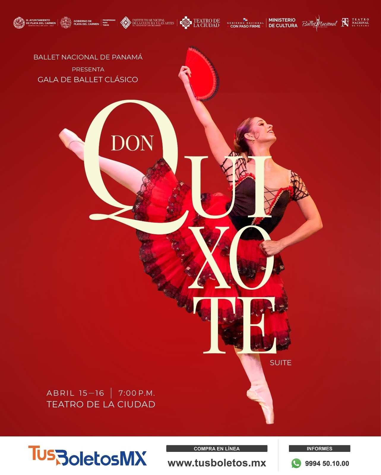 Playa del Carmen, Quintana Roo, 13 de abril de 2026.- A un costo accesible, ya están a la venta en taquilla del Teatro de la Ciudad, de las 10 de la mañana a las 6 de la tarde, los boletos para las funciones del Ballet Nacional de Panamá, los días 15 y 16 de abril a las 7 de la noche con su espectáculo suite “Don Quixote”. También, a través de www.tusboletos.mx