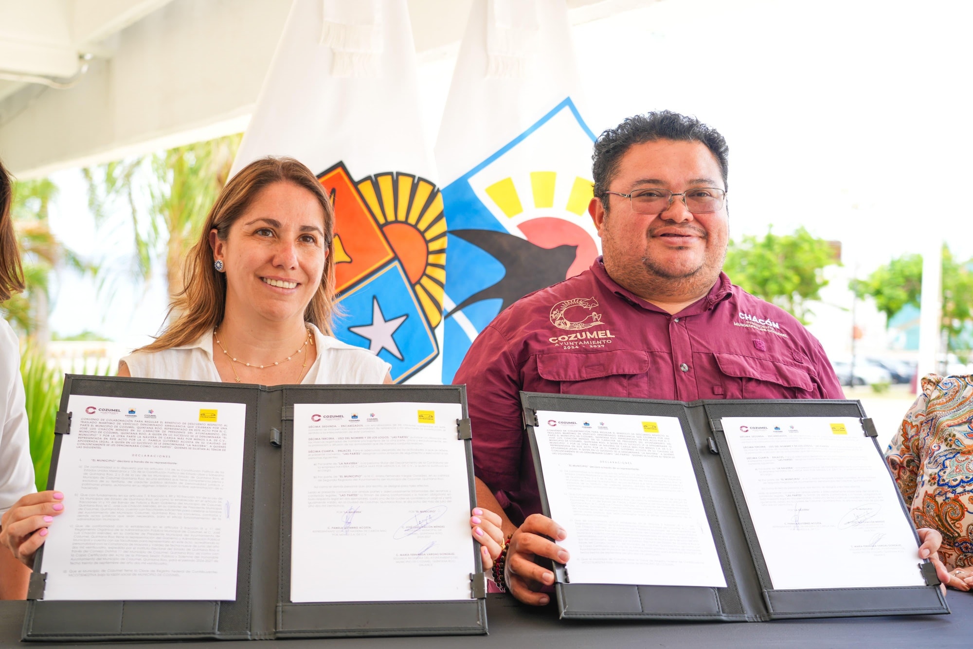 Cozumel, Quintana Roo, 8 de julio de 2025.- En un acto de voluntades en beneficio de Cozumel, el presidente municipal, José Luis Chacón Méndez y Pamela Gutiérrez, representante de UltraCarga, firmaron un convenio que otorgará un descuento para el traslado de ambulancias de Calica a Cozumel y viceversa.