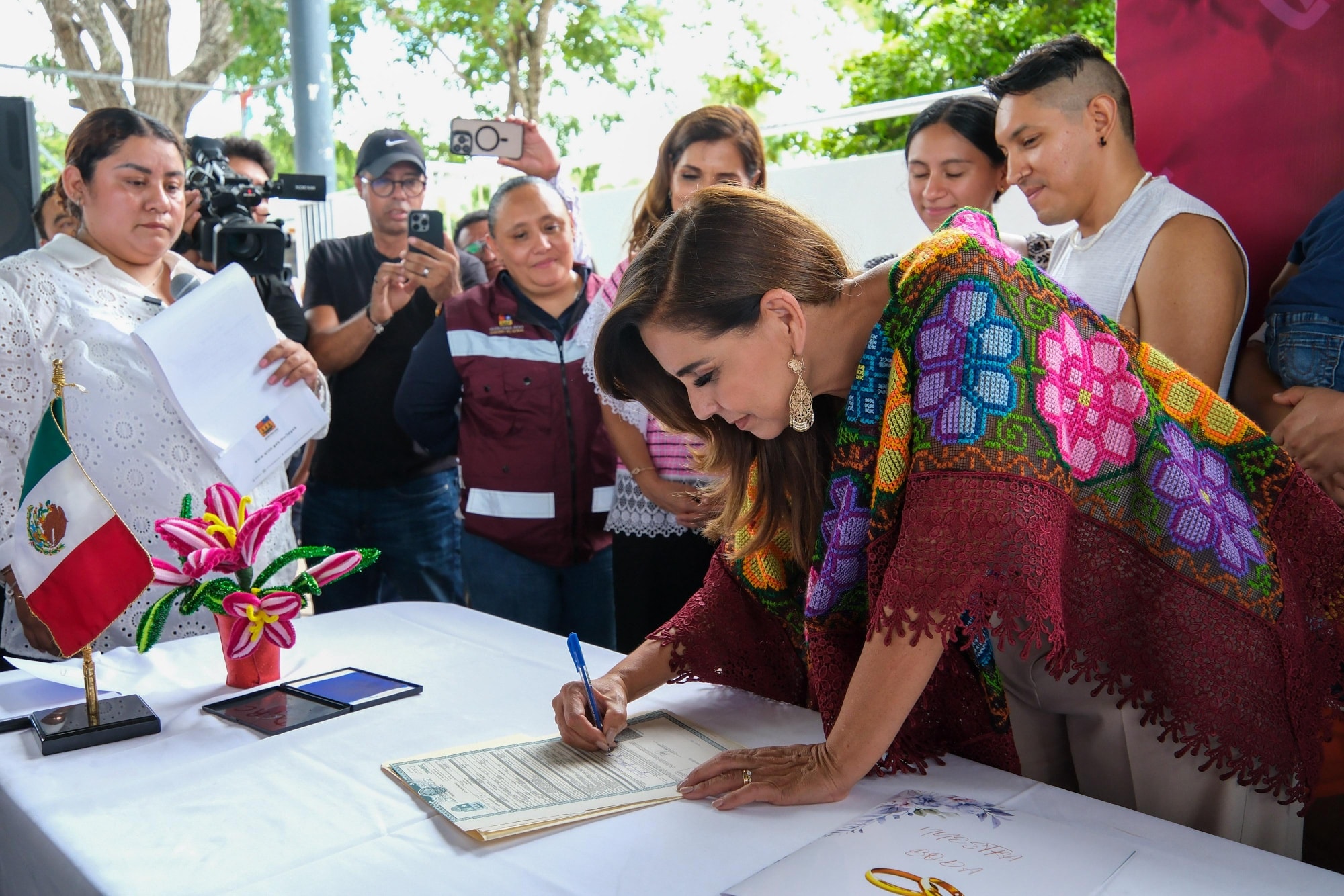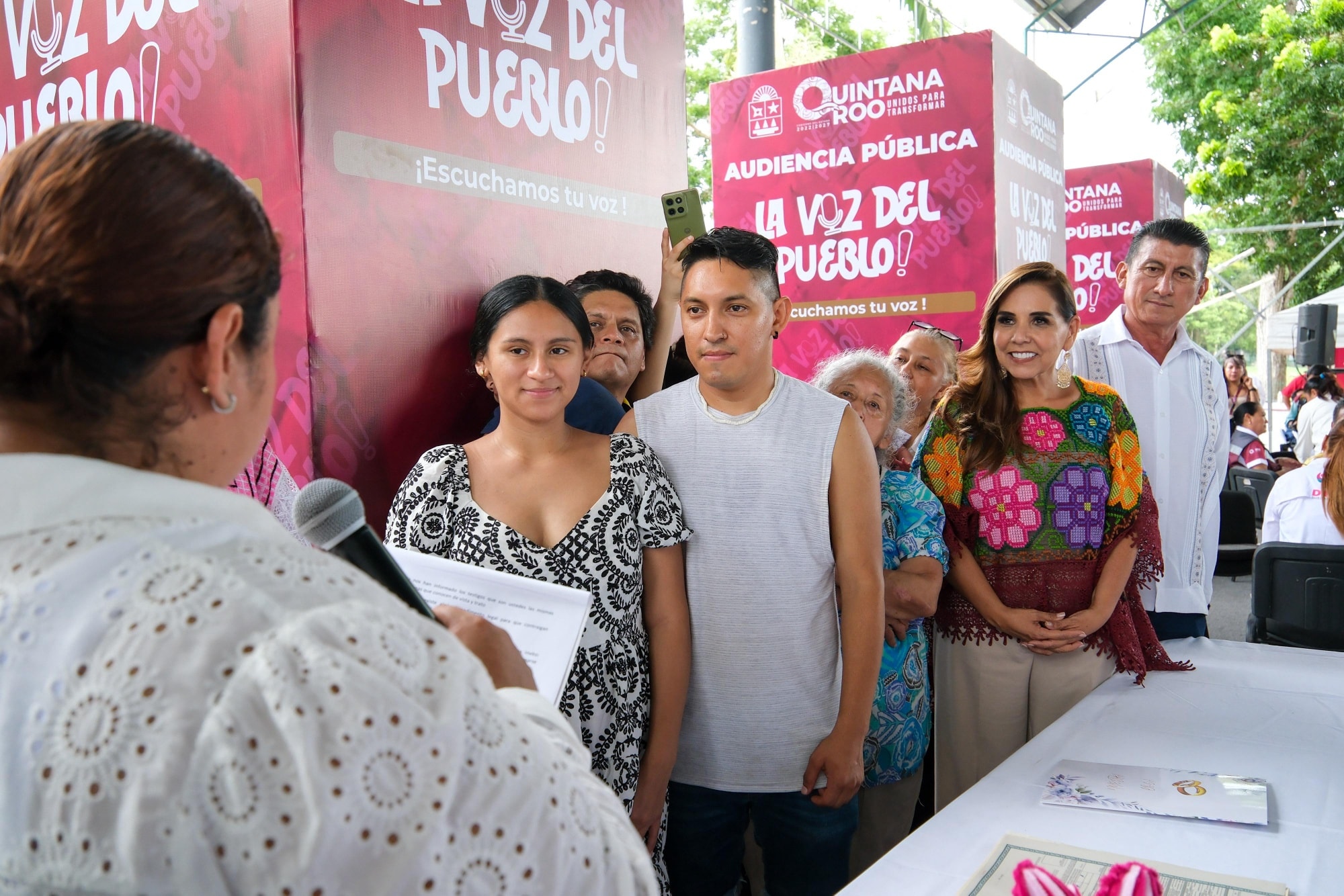 Como parte de las atenciónes en esta jornada, Mara Lezama entregó a Maricarmen Cárdenas Hernández su título de propiedad, promesa que le hizo en la pasada audiencia pública. De 72 años de edad y vecina de Puerto Morelos, tuvo que esperar 15 años para tener la certeza de su propiedad, y hoy la Gobernadora se lo hizo realidad. El trámite se hizo a través de la AGEPRO. “Ya no hace falta esperar; esto hacemos los gobiernos diferentes de la Cuarta Transformación”, dijo la titular del Ejecutivo.