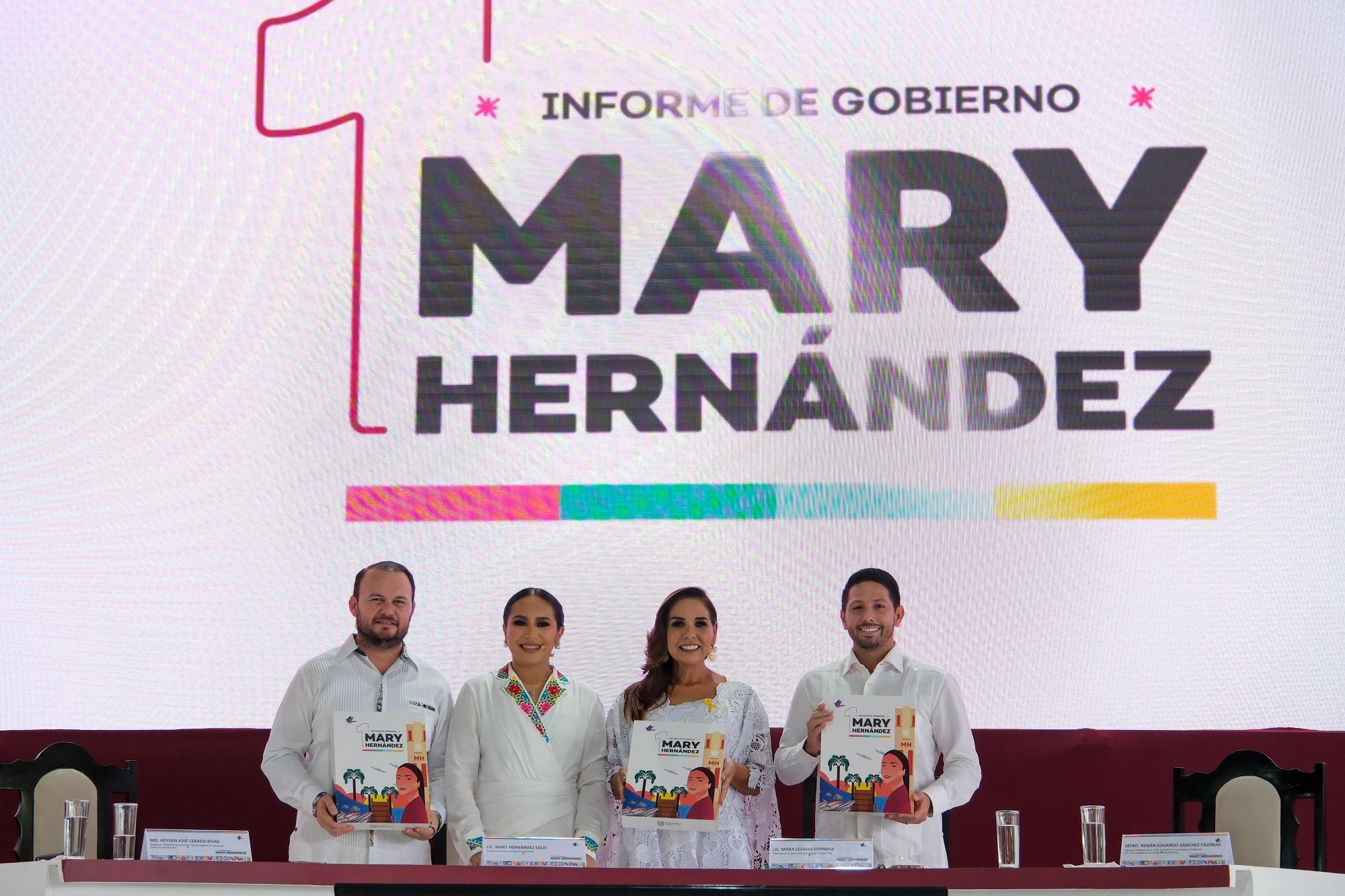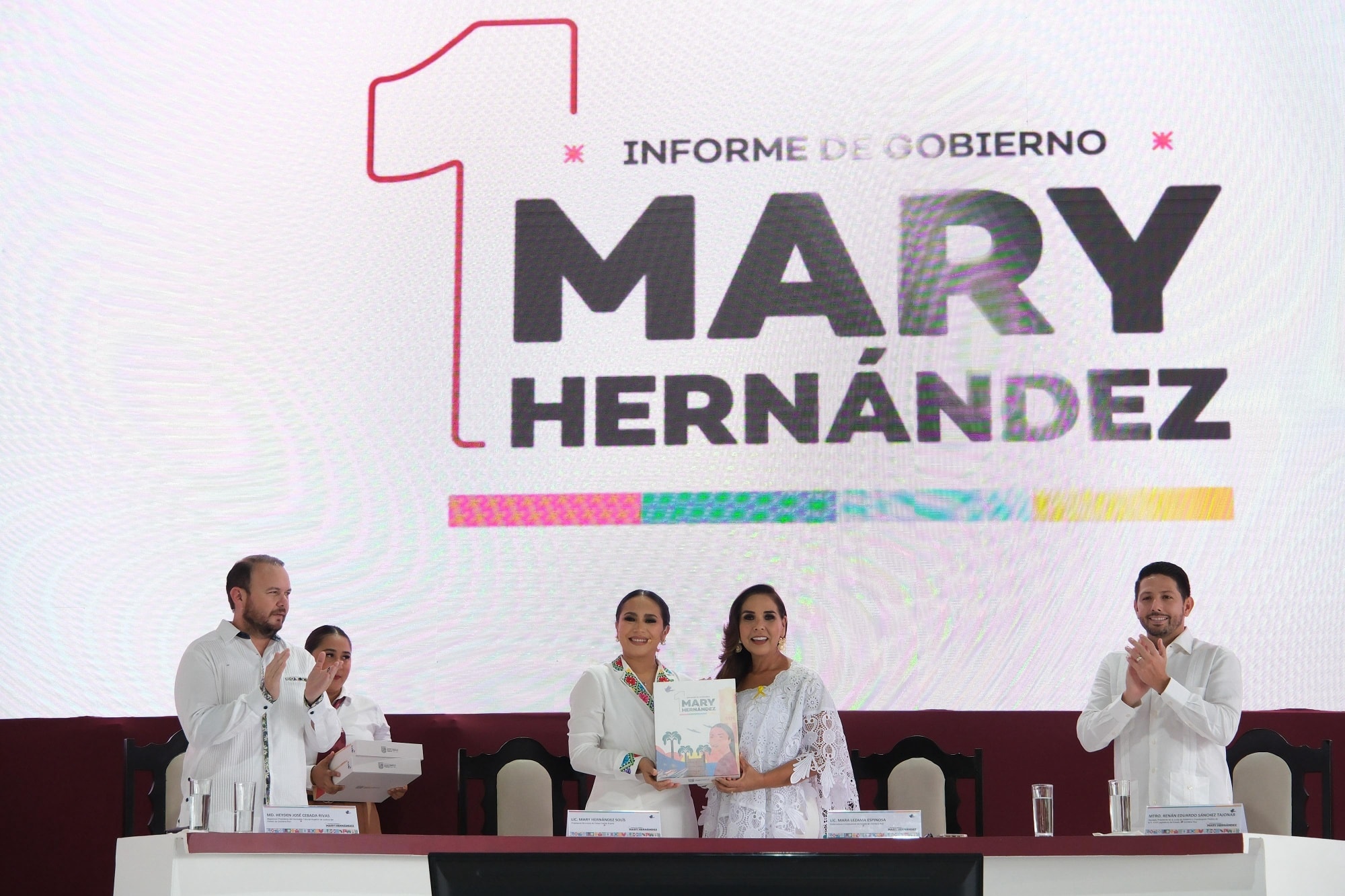 Felipe Carrillo Puerto, Quintana Roo, 10 de septiembre de 2025.- La gobernadora Mara Lezama Espinosa recibió, en sesión solemne de Cabildo, el libro que contiene el Primer Informe de Gobierno Municipal de la presidenta Mary Hernández, en el corazón de la zona Maya, administración 2024-2027.